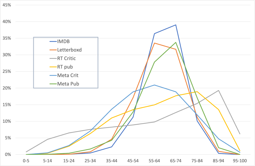 Different series of ratings have quite different distributions of scores. The chart below shows the distribution of each of the of ratings by interval. Ratings are converted to a percent scale by simple multiplication of ratings. For example, Letteroxd ratings, which are on a scale of 1-5, are multiplied by 20. No other adjustments are made.